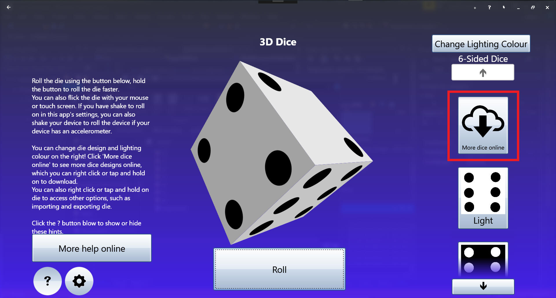 To access online dice, click or tap the 'More dice online' button at the top of the 3D dice list on the right and then click or tap a die to preview it.