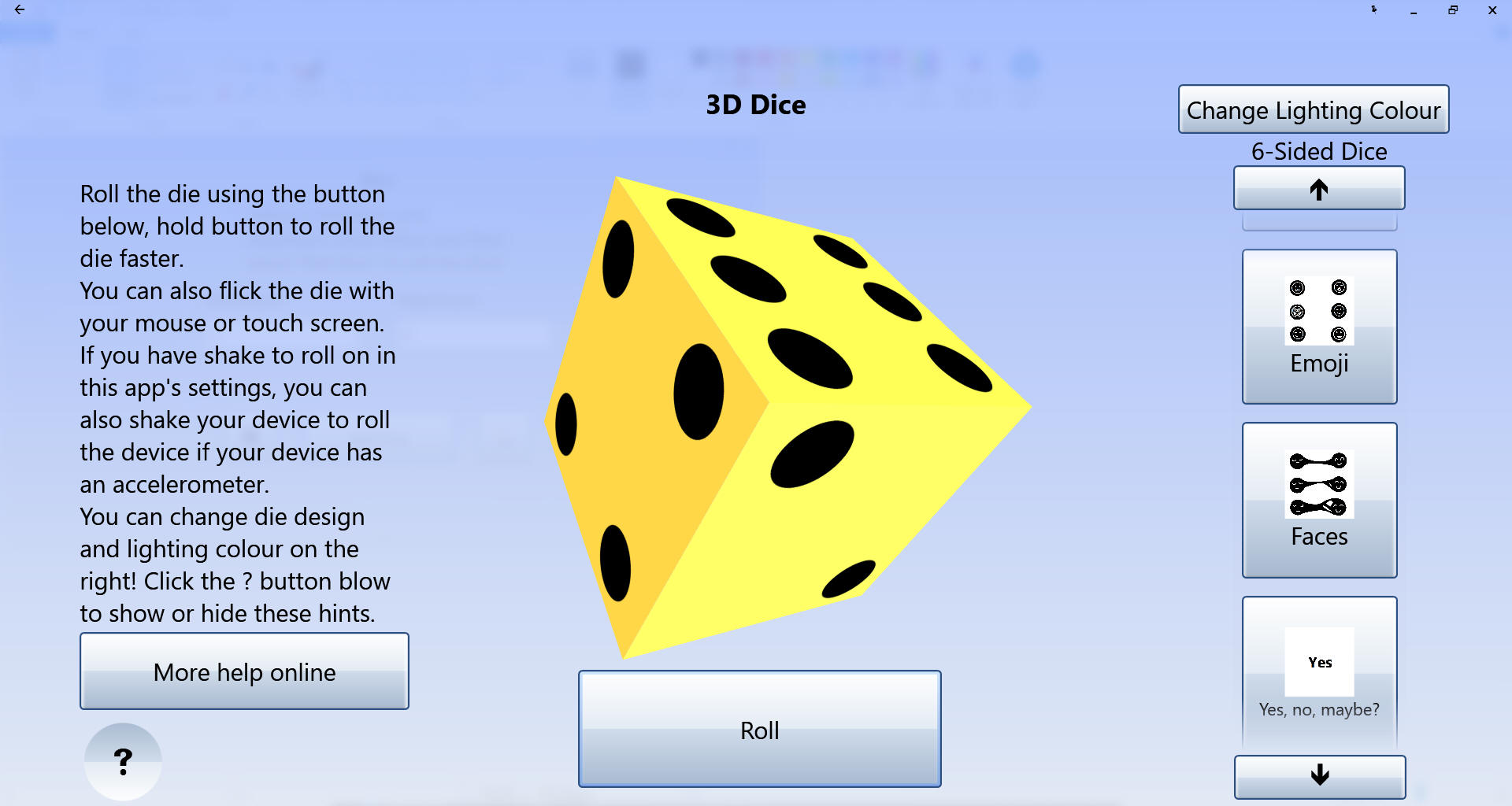 -3D Dice can be rolled by flicking with mouse or touch screen and by shaking the device if it has an accelerometer and this option is enabled in settings. You can also roll the dice with a button. The speed and randomness of the roll is determined by how long you hold the button.